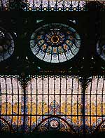入口の階段を登ると、これだこれだ、噂のステンドグラス。夜だからいまいち華麗さはわからないけど、確かにクラシックで重厚な作りのホテルだ。