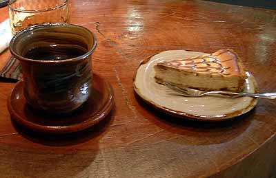 お気に入りになった店。国際通りを県庁のほうから見て左に入った道沿いにあります。表通りに出ている「コラーゲンコーヒー」という怪しげな看板に惹かれて行ってみたのですが、実際にはとてもシックで落ち着いたインテリアの喫茶店+薬草茶ショップでした。すいているので時間を気にせずゆったり過ごせます。 薬草茶(日替わり)100円、写真の豆腐で作ったチーズケーキ300円、うこんのパンのトースト(季節のジャムとごまペースト添え)250円といったお値段も良心的です。