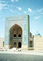 その後はもう、青タイル攻め。バスでレギスタン広場まで行き、3つのメドレッセ(イスラム学校)を見たあと、修復中のビビ・ハニム寺院へ。ところで、今回の旅行ではほとんどのモスクは中には入れなかった。そのために長いズボンしか持ってこなかったのに〜。ターニャさんの説明がいまひとつわからなかったのだが、イスラム寺院は今ではメッカの管轄下にあり、ウズベキスタン政府やインツーリストには権利がない、ということらしい。