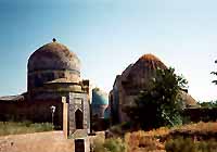 次にアフラシャブの丘の麓にあるシャーヒ・ジンダ廟に行った。ここは、イスラム教徒の墓地なんだそうだが、見たところは古い街といっ た感じ。両側を石壁にはさまれた石段を登っていくと、日干しレンガで作られた廃墟に迷い込んだよう。ポンペイの遺跡を思い出してしまう。 両側にいくつもの廟が並び、そのそれぞれが青タイルで思い思いに飾られていて、見あきることがない。というより、見あきるほどの時間がもらえないのだ。日本人がアクセクしてるなんて嘘だ! ターニャの口癖は「時間がギリギリです」なんだもの。ここはもう少しゆっくり見たかったなあ。