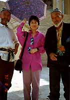 ヒワでいちばん印象的だったのはジュマ寺院、別名「金曜日のモスク」。10世紀に建てられたと聞いた、涼しくうす暗い寺院の内部には213 本の木の柱が林立している。この中の数本は、当時からのものだというのだ。柱1本1本に細かく彫られた模様がすばらしくて、時の立つのも忘れて見入ってしまう。30年も旅をしている山羊田さんが言うには、インドのヒンドゥー教の寺院(ミーナクシー寺院?)の1室と造りがまったく同じだそうだ。さっき見たハーレムはスペインのアルハンブラ宮殿のものと同形だったそうだし、「イスラムはスペインにも南インドにも14〜15世紀頃には勢力を持っていたということよね!」と興奮していた。