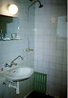 洗面台とトイレとシャワーの床が地続きのタイル。もちろんシャワーカーテンはない。ってことは、シャワーを使うと全部びしょ濡れになるわけね。まあ、でも、タオルも石鹸もトイレットペーパー(薄茶色でごわごわだけど)もある。上等ではないか。