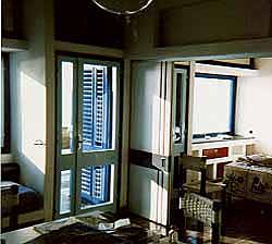モンドリアン風は全館通じてのコンセプトらしく、室内もやはり塗り分けられている。しかも、さらに幾何学的な立体感を強調するため、あちこちに意味のないコンクリートブロックの出っぱりがくっつけられている(まあ、これは物を置くのに便利だったけど)。きわめつきはクローゼット。なんと襖(木製だけど)がついている。