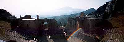 ところで、どうしてイタリアなのにギリシャ劇場なの?と思われるだろうが、シチリアというのはめまぐるしい変遷を経てきた島なのだ。先住民のシクリ族が住んでいたところに、紀元前8世紀頃に古代ギリシャ人が移住。各地にギリシャ人の都市国家が出現した。次にカルタゴ人が来て、紀元前3世紀頃にカルタゴがローマに滅ぼされてからは、ローマの支配下に入る。その後、6世紀にはビザンチン、9世紀にはアラブ、さらに11世紀にはノルマン人、13世紀にはドイツ、フランス、14世紀にはスペインと次々に支配者が変わり、そのたびにそれぞれの文化の痕跡を残していったわけなのね(このへんは政府観光局パンフの受け売り)。だから、キリスト教の寺院にアラブ風の装飾が見られたり、ギリシャ様式の遺跡があったりする。