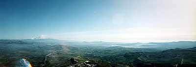 石段をヒイヒイ言いながら登りきると、ほんとにほんとのてっぺん。まわりに柵などない、ただの岩山なので、石につまづいてグラッとしたりすると、平野部のほうまで900メートルほどを転げ落ちてしまう。でも、眺めはすご〜い!360度パノラマで、はるかかなたの山の上に、こちらと同じような街が固まってあるのが見える。空も広く、高度のせいか、紫色の雲がたなびいている。ずうっと眺めていると、どこからどこまでが視界に入っているのかわからなくなる。しばし茫然と眺めいってしまった。
