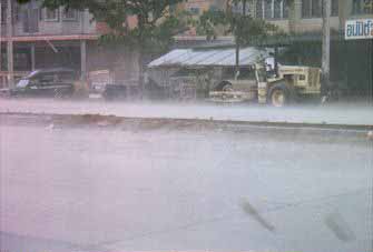 噂に聞いていたスコールは、本当にすさまじいものでした。この写真、私の腕が悪いせいではありません。白っぽく写ってるの、雨なんです。まさに叩き付けるように降りました。でも、タイの人達は傘なんかささずに悠然と歩きます。雨があがればすぐ乾きますものね。 観光客の私はバスの窓から眺めているだけでしたが、まいったのは寒さ。なんでもスコールのときに冷房を切ると車内に設置してあるトイレが匂うんだそうです。体は冷え切ってくるわ、天井から水は漏ってくるわで、こんなことなら外で濡れてるほうがよっぽど気分がいいだろうと思いました。 |