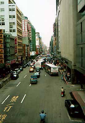 台北の街並み。とにかくバイクとスクーターが多い。大陸中国の自転車に匹敵する。向かうところ敵なし、といった勢いで車の横をすり抜け、わがもの顔で走っていく。スカート姿のOLもポロシャツ姿のおじさんも、ヘルメットをかぶり、通勤に遊びにと乗り回す。