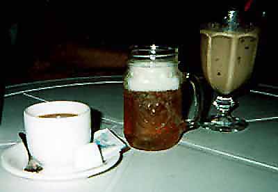 公園の隣りのオープンカフェ(台北)。アイスコーヒーを発見。ビールのジョッキは、ジャムの壜をリサイクルしたかのように口がねじになっていた。