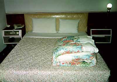 台湾では3種類の宿に泊まった。中級ホテル、経済ホテル、そして旅社。これは経済ホテルの室内(台北の PAN AMERICAN HOTEL)。ふとんは、なぜかこのように畳んでベッドの上に置かれている。安い旅社だと、シーツも枕カバーもベッドカバーもなく、ふとんカバーもとりはずしができない(洗濯しない?)ようになっている。軟弱者の私は、スーパーで不織布のテーブルカバーを買い、それにくるまって寝た。