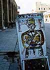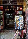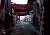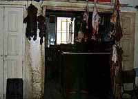 肉屋の例の牛首、ここでは干からびて皮だけになり、鼻も耳もほっぺたも垂れ下がった哀れな姿をさらしていた 石畳の両側に石を積んだ建物が続く路地には、壁一面にカラフルな絨毯が掛けられて、売り手を待っている。路地の上空にアーチのように掛けられているものもあり、さながら色彩で埋めつくされた空中楼閣だ。 ここの絨毯は、イスラムでは珍しく人間やラクダの形が幾何学的な模様になって織り込まれているのだそうで、見ていて楽しい気分になってくるのはそのせいかも。 小さな店でチュニジア音楽のテープを買った。店番の男の子に「伝統的なのがほしい」と言ったら、「これだこれだ」と出してきて、ラジカセにかけてくれる。「ちょっと違うな」と言うと、次のを出してくる。開封も未開封もあったもんじゃない。いくらでも商品を聴かせてくれるんだから、これなら絶対に失敗しない買物ができるぞ。 |