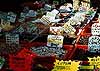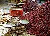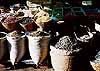 「これはな〜に?」 おもしろい。買って帰ろう。←帰国後、使ってみたが、水に濡らすと粘土のように白く溶けてくる。これを髪にこすりつけて、泥のパックみたいにするのかな。泡は立たないし、シャンプーと呼ぶのはちと難しいものがあった。 近所のおじさんが紐をつけた犬を連れて散歩、と思ったら山羊だった。子山羊が2匹、うしろからトコトコついてくる。おじさん、店の前まで来ると、そのへんの椰子の木に紐を結びつけて、買物に行ってしまった。山羊はあたりの草を食べておとなしく待っている。 帰り道もまた風にびゅうびゅう吹きまくられながら、ようやくのことでバスにもどった。 「楽しかったですか?」としらじらしく聞くモグラ氏に 「どうして行かれなかったんですか?」と聞き返す。 「私、風邪ひいてるもんですから」 「(・_・)」 ようやく暖かくなってきた街に出て、スパイス市場に入る。ここは、あらゆる種類のスパイス、香料、乾物がメインに売られていて、今ま で見たところとはひと味違う。何に使うのか、イグアナの干物が篭に無雑作に盛られている。どう見ても枯れ木としか思えないものはお香、石のようなものは化粧品らしい。 ピーマンのように大きな、干したとうがらしがピラミッド状に積まれている。観光客用には小袋に分けたものがあるが、地元の人達はみんな計り売りで買っていく。古色蒼然とした計りで計ってもらいたくて、ついついとうがらしとにんにくとそら豆を買ってしまった。私ってば、どうするつもりなんだ(^_^;)。 |