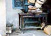 「料金は5ディナールだそうです」 どうしようかなあ・・・ 「もちろん、馬車には乗らずにこの辺を散歩していただいてもけっこうでございます。ただ、ひとつご注意申し上げますが、ナツメヤシ泥棒対策に林の中に番犬が放してあります。これが警戒心の強い犬ですので、うっかり近づくと噛みつかれます」 ほとんど全員が馬車に乗ることになった。 しかし、この馬車がつらかった。いくらチュニジアだって、冬の朝は寒いのだ。そんな所を、風を切って走る馬車に乗る人間なんて、ふつういない。うしろを振り返れば、モグラ氏はしっかりバスの中に残っていた。 1台に3人くらい乗れるのだが、シートがビニール張りですべるうえに、馬車が揺れるから、うっかりしてると振り落とされそうになる。 やっとのことで折り返し点まで来て、土産物屋の前でいったん降ろされた。なにやらモウモウと煙りがたちこめている。見ると土地の人が集まって焚き火をしてるではないか! 「わ〜ぃ!焚き火だ焚き火だ落葉焚き」とばかりに混ぜてもらい、冷えた体を温めた私たちであった。しかし、寒い日に火を囲んでなごむ習慣というのは、万国共通なのだな。これで、焼き芋でも焼いていたら申し分ないのだが・・・。 土産物屋の店先に、小石のようなものが積まれている。