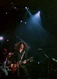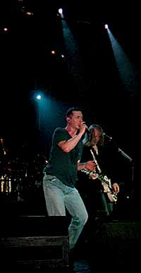 危惧していた衣装だが、ありがたいことにダニーはリハーサル時と同じ紺の半袖Tシャツにジーンズだった。これも決してかっこいいと言えるような代物ではないが、ジャージやポロシャツよりはマシでしょう。聞いた話ではWOLVERHAMPTONでは水色の細かい縞の入ったまるでおっさんのゴルフ行きみたいなポロシャツでステージに立ったそうだから。ジーンズも昔はわりと大き目のをベルトで腰のところをきゅっとしめてはいていたものだけれど、いまではキツキツではいているものだから、ポケットに手をつっこんで出すと、ポケットの裏布が外にはみ出し てしまい、両側ともダランとたれている。それをまた気がつかないままで踊ったり歌ったりしているのが、なんともいえずガキっぽい。でも、いつのまにか直ってたのは、メンバーが注意したのかしら?