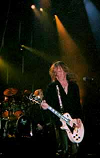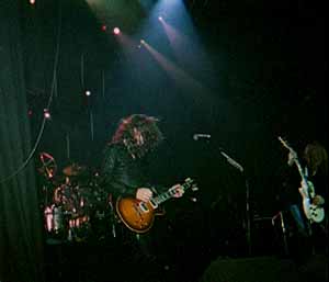きのうと同様"SMOKE ON THE WATER""CAN'T GET ENOUGH"ときて、さらに"IN A BROKEN DREAMS"まで入ったところで始まった。今夜はなんと、ハリーが燕尾服とシルクハット、ステッキでキメて登場し、"LONDON, LONDON"をソロで歌う。ときどき、ミュージカル俳優のようにステッキを投げてみせたりして、なかなかの役者ぶり。歌い終わるやいなやメンバーがよってたかって燕尾服を脱がせ、派手なサッカーシャツ姿の本来のハリーに戻してしまう。うむ、このシーンはビデオのオープニングに使われるんじゃないだろうか?