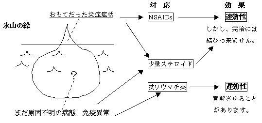 慢性関節リウマチの患者さんに薬を処方する時、私はこの氷山の絵をかいて説明させていただいています。
