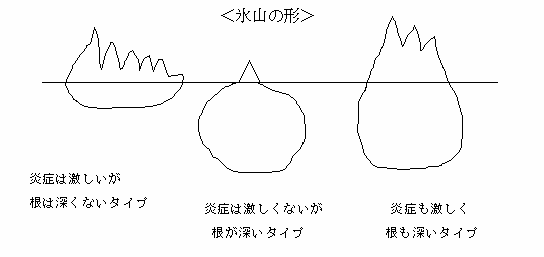 14. これは私の印象ですが、同じ病名でも氷山の形は、個々で全く異なりそれぞれの患者さんが受ける治療方法もそれによって異なって当然と思います。
