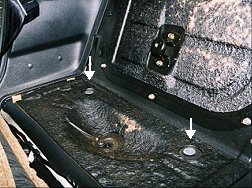 先ほども出てきたこの写真、実はAZ−1には他に類を見ない面白いものがついている。それは矢印の部分のゴムのキャップを取ると現れる。何が現れるかというと、ネジの切ってある穴がでてくるのだ。この穴は4点式シートベルトを固定するのに使うアイボルトがピッタリはいるのだ。明らかににスポーツ走行を前提とした作りになっている。