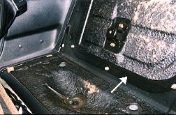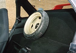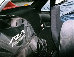 AZ−1のもう1つの特徴は、スペアタイヤが室内に存在する点である。写真には「AZ−1」と書いてある袋があるが、これはオプションのスペアタイヤカバー(現在入手不可)で、この中にスペアタイヤが入っている。この写真は運転席側から見た物だが、今度はカバーを取って助手席側から見てみると、このように取り付けられているのだ。