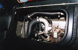 写真は蓋をはずしたとことである。AZ−1の場合、ミッションが助手席側にあるため、運転席の後ろ部分の位置でエンジンが正面にみえるようになる。蓋を開けるとターボチャージャーが真正面に見える。写真にはパイプが2本写っているが、これはインテークのパイプとなる。上の方はインタークーラーからインマニへ、下の逆U字型のパイプはターボからインタークーラーにつながっている。代表的なエンジンルーム作業の1つであるプラグの交換も、このメンテナンスハッチを使って行われる。AZ−1はミッドシップであるため、エンジンルームからではプラグに手が届かないためだ。なおメンテナンスハッチからエンジンをいじる場合は、運転席・助手席を取り去って、作業空間を作る必要がある。