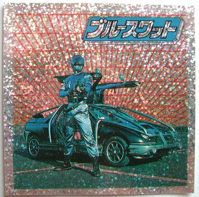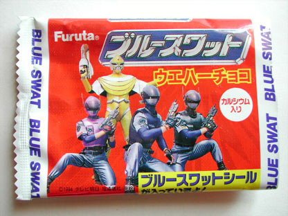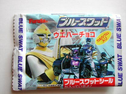 Furutaのウエハーチョコのパッケージとオマケに付いていたブルースワットシール。提供はB3Hさん。
