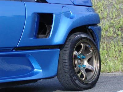 完全自作のFRPブリスター?フェンダー。片側6センチ出ます。同時に、インテークのフィンを切り飛ばしましたが、内部導風板まで気合がもちませんでしたフューエルリッドは純正のままです。メーカー共同企画のM10用カラーアルミナット(貫通型)です。19HEXになります。ホイールはTE37 14” オフセット±0 6.5JタイヤはピレリP6000 175/50/14です。 サイドシルは GIVEのものです。