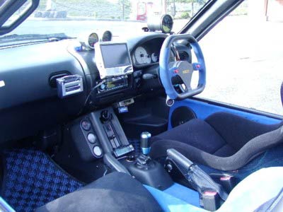 メーターフェチです(爆ダッシュ上に 大森タコメータ80Φ、サード製水温・ブースト計60Φ。純正OP3連フードだけ利用して、三菱ランエボ3用ブースト・電圧・油温計各40Φに取替え。スパルコのD型32Φステアリング+FET製クイックリリース(よく壊れます)自作スピーカーボード(OSB合板12ミリにエクセーヌ張り JENSEN16センチスピーカー)パナソニックCDナビ、ビリオンファンコントローラBV5、エンジンルーム内温度計。カロマットです。