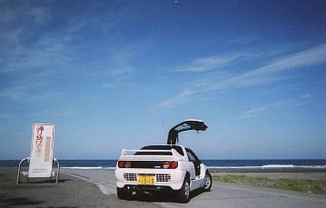 海岸そばの1枚です。砂浜まで行って撮りたかったけど、車高の低い車ではめり込むため断念。写真の場所もちょこちょこ車が通るので、一緒に来ていた友人(砂浜のオレンジの点)に撮ってもらおうと思ったら、勝手に海の方へ(おーい、怒)。タイミングを見計らってようやくパシャリ。看板が写ってしまいましたが青い空と海の南国のイメージは少しは伝わったでしょうか? あとAZ−1はフロントマスクもイケていますが、個人的にはこのアングルからの絵が好きです。