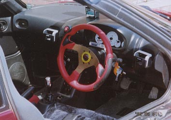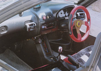 コンポはアルパインのCDプレーヤーです。2ヶ月前に買いました。知り合いのつてで安くしてもらいました。MP3/WMA対応でドライブ中にお気に入りを長く聞けるし、とっても満足しています(最近は頭文字Dの影響からユーロビート系が主流です)。シフトノブはオークションで買った上部シフトパターンが青いLEDが振動で反応して光る奴です。LED3つ使ってて思っていたより明るくて好きになりました。