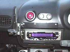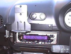 据え置きNAVIの据え置くところがない為、ポータブルタイプのPANASONICのでるナビを装着。最初はダッシュボードの上に付属品のスタンドを使ってつけていたけど、前方視界は悪くなるし、走行中にふらふら揺れて、落ちつかない。衝突した時にはナビで頭を割られそう。ベストのポジションはオーディオの真上。でもそこにはハザードやフォグのスイッチが・・・。という事で、ナビのスタンドを自作。コンソールパネルにつけたステーに蝶番でナビが装着されるステーを取り付けて、ごらんの通り可動可能に。これならば隠れたスイッチも操作できます。蝶番もしっかり保持するタイプなのでどの角度も固定可能。もちろんぐらつきません。