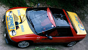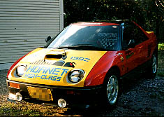 これは1994年5月ごろから1995年6月ごろにつけていたボディです。1994年の4月ごろに”セガ”からゲームセンター用体感ゲーム機の”DAYTONA USA”という物が世間に出回り、その当時としては非常に綺麗なグラフィック、音楽には歌まで入り、すぐにのめり込んでしまいました。その頃、僕のAZ1はマツダスピードのボンネット、リアウイングを着けていて、家にはノーマルのボンネット、事故をして少しだけ割れたエンジンフードがありました。そこで自分の車、余っているパーツ、これを組み合わせると”DAYTONA USA”の”ホーネット号”が作れると思い実行しました。こんなカラーリングは日本人の感覚ではあまり思いつかないし、とにかくこれは目立つだろう、しかも黄色に塗装する部品はいらないような物だけで済むという事で早速そのゲームの攻略本を手に入れ、定規、計算機を駆使して比率等をもとめ、カッティングシートでマーク、文字を作り、ビートの黄色のスプレー10数本を使いボンネット、エンジンフードを塗装し完成しました。変なデザインの為、暴走族等と勘違いされないように仕上がりにはかなり気を使いました。(暴走族、ヤンキーの塗装はまずムラが多い、艶は全然ない場合が多いと思います。)これで選挙の投票所に出かけた時、おじさんおばさん子供に囲まれ「外車ですか」「かっこいい」「すごいねー」等と言われ成功したなと思いました。それでも1年間この格好で走っていて確認した分で2回ほど子供がこちらを指さしたり、じっと見たりしてると、親が子供に見せないように手で子供の顔をかくしたり、頭の向き変えさせたりする事もありその時は少し悲しかったです。それでも他の車に乗ってる子供が手を振ってくれたり、こっちが手を振り替えすと、その車に乗ってる人全員で手を振り返してくれる事もあったり注目度は他の車に比べ非常に高く、色々な思い出もあって、楽しかったです。