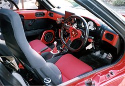 赤い部分はカッティングシートです。シフトブーツ、サイドブレーキブーツも本皮の自作です。(裁縫なんてほんとに何年ぶりでした。手が血まみれになりました)スピーカーボードを作りボーズの16cmのスピーカーをつけてます。後、消化器、カーナビ、デジタルスピードメーター、燃調コントローラー、VVC等ついてます。ジュースホルダーは本物のカーボンで作ってます。シフトゲートはアルミ板を切ったものを使い、シフトノブはアルミの丸形の物にし、その軸の部分が黒かったので、ステンレスのパイプを通してます。