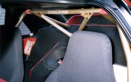 これはロックフォードのウーハーです。BOXは自作です。(ちゃんと容量の計算して作ったつもりです)。マツダスピードのステッカーが貼ってあるロールバーがありますが、マツダスピード製ではないです。形だけのロールバーです。