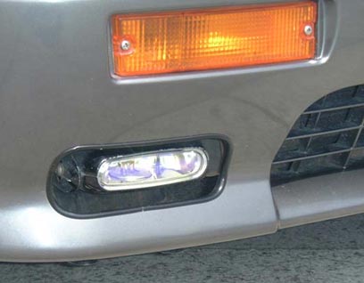 フォグランプは極東の品。CARAのブラケットを使って取りつけています。バンパーには最小限の穴。