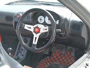 ステアリングをアバルト3スポーク(入手困難)に変更。ちなみにボスはアルト(笑)用。シャフトは奥のマウントにワッシャかまして上げてあります。