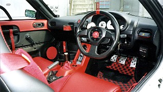 カラーリングはノーマルの赤・黒を基調とし、コンソール等はスウェード調スプレーで塗装しています。本皮シートは乗り心地、タッチ共に上々です。ちなみに費用は2脚セットで12万円といったところで安い方だと思います。