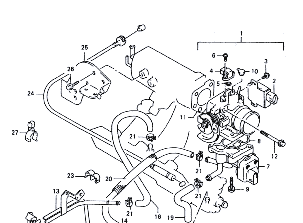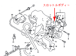 赤の矢印で示してあるのがスロットルボディー。2,3型にはスロットルボディーにISCバルブが内蔵されているなど、大きく異なっている。