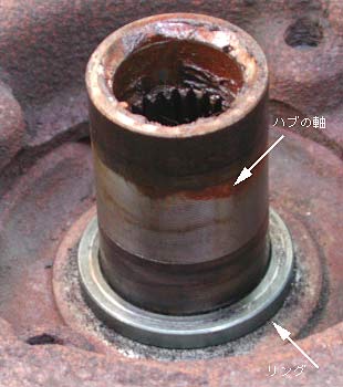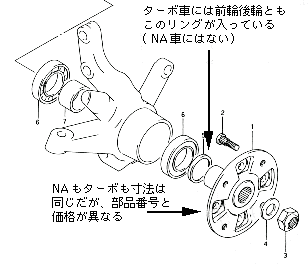 NA車には矢印で示したリングが入っていないが、ハブの寸法・スタッドの寸法はNAもターボも一緒である。ただし部品番号と価格が違うため、材質が異なるものと思われる。ターボ用のハブが欠品の場合は、NA用のものがなんとか使えると考えられる。