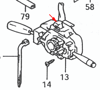 絵は全然違うが、ほとんど同じものである。矢印で示している部分(ハザードスイッチ)を切断すると、AZ−1でも使えるようになる。なお、AZ−1のステアリングコラムカバーに穴を開けて、ハザードスイッチが入るようにしてもよい。その場合、コンビスイッチについているハザードスイッチとAZ−1に元々ついているハザードスイッチの両方が使えるようになる。