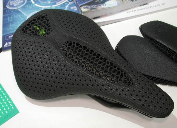 自転車のサドル。これは試作品ではなく製品なのだそうだ。となると、各種耐久性もクリアできているんだろうなあ。
