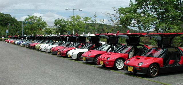 会場内は、車種毎にまとめてではなくバラバラに駐車する。ただし交通整理ボランティアがいれば、同一車種でまとまって駐車してよいことになっていた(公式HPでもアナウンスあり)。AZ−1の場合、ボランティアがいたから写真のように駐車できた。逆に言うと、ボランティアのなり手のなかったビート、カプ、コペン、S660はまぜこぜで駐車していた。
