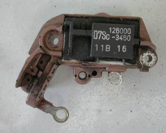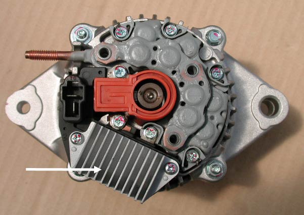 矢印で示すヒートシンクのついた部品がレギュレータ。レギュレータは発電電圧を一定にする(14V程度にする)ための部品だ。これがないと、オルタネータの電圧は14Vを大きく超えてしまう。