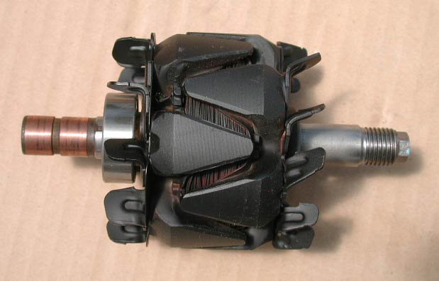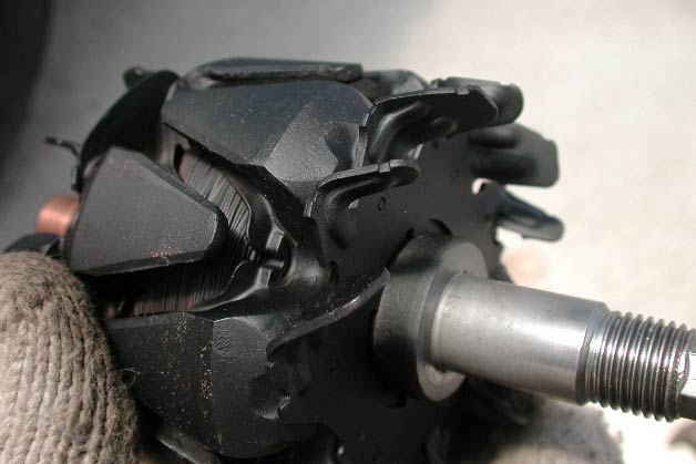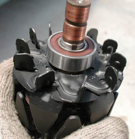 ロータ本体で重要なのはブラシと接触するコミュテーター。中古のオルタネータは段付き摩耗しているのだが、こいつはそうなっていない。恐らく修正されたのだと思われる。ここにはカネをかけている。