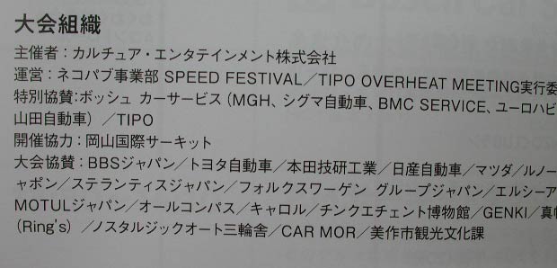 頂戴した冊子の記載事項から、本ミーティングの概要を見ていく。まず本ミーティングの正式名称は、「Bosch Car service Presents SPEED FESTIVAL 2025 with TIPO OVWERHEAT MWWTING」である。長い!! 前頁では「スピードフェスティバルとして復活した」と書いたが、正確にはTIPO OVWERHEAT MWWTINGと共催という形なのだそうだ。