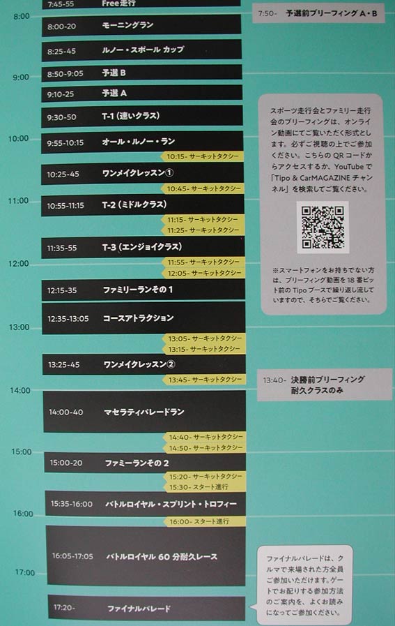元に戻ってイベント内容をざっと見ていく。タイスケを見ると、TIPO OVWERHEAT MWWTINGの時と大きな変化はない。無いものと言えば、昼の時間帯に行われていたコース上での記念撮影ぐらいかな。