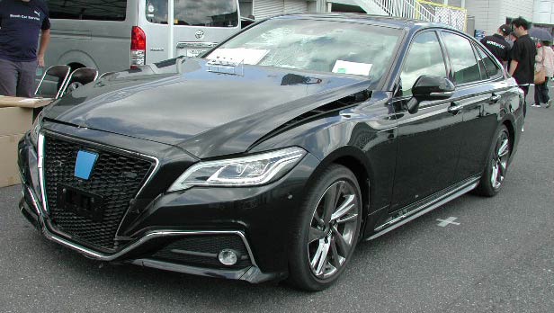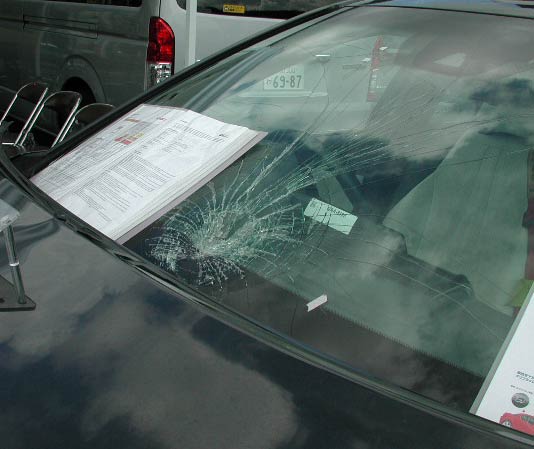 テントの近くに事故したクラウンが置かれていた。人をはねて頭がフロントガラスに当たったというシチュエーションだろう。