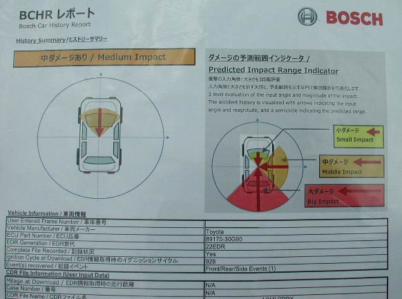 クラウンのコンピューターはボッシュ製でないので、他社(恐らくデンソー)のコンピューターからデータを吸い出している。これらのデータから、例えば綺麗な外観の中古車でも、過去に事故を起こしたかどうかが調べやすくなる。