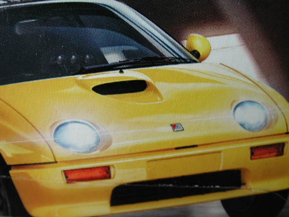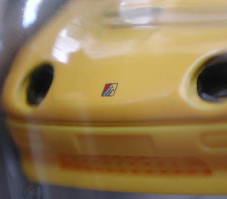 ボンネット上のオートザムのマークを見る。このモデルの場合、純正マークでは青色だった部分が透明になっている。そのため、青であるはずの部分が黄色になっている。