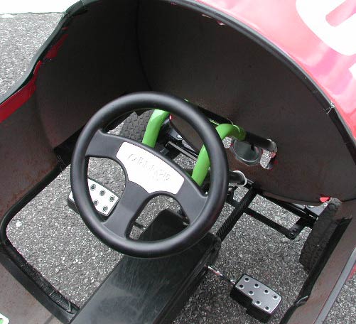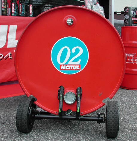珍しいので詳細を見てみる。実際に乗り込んではないのだが、子供が乗ると前が見えないんじゃないかというような形状並びにシート高さになっている。ドラム缶の形状を最大限残すようにするためなのか、小さめのタイヤがついている。