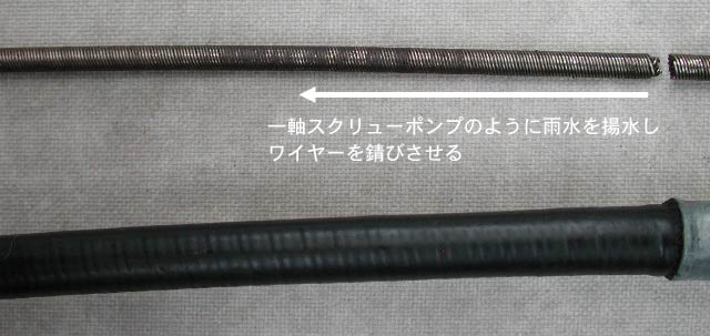 ここから水が浸入するとして、もう1つの疑問がある。スピードメーターケーブル全体に錆が点在するという事実だ。これはケーブルが「スクリューポンプ」だと見立てると説明可能だ。スクリューポンプとは、ネジ山状の羽根が回転することで水をくみ上げるポンプのことだ。スピードメーターケーブルが回転することで、雨水が吸い上げられケーブル全体に錆が発生すると考えられる。