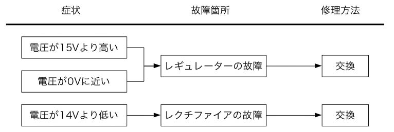 故障診断フローチャートとして簡単にまとめてみた。なお代表的な症例をまとめただけで、別の原因である場合や、種々の原因が複合している場合もある。